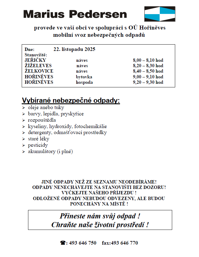 Marius Pedersen provede v naší obci ve spolupráci s OÚ Hořiněves mobilní svoz nebezpečných odpadů v sobotu 22.11. 2025. Harmonogram zastávek naleznete v příloze.
