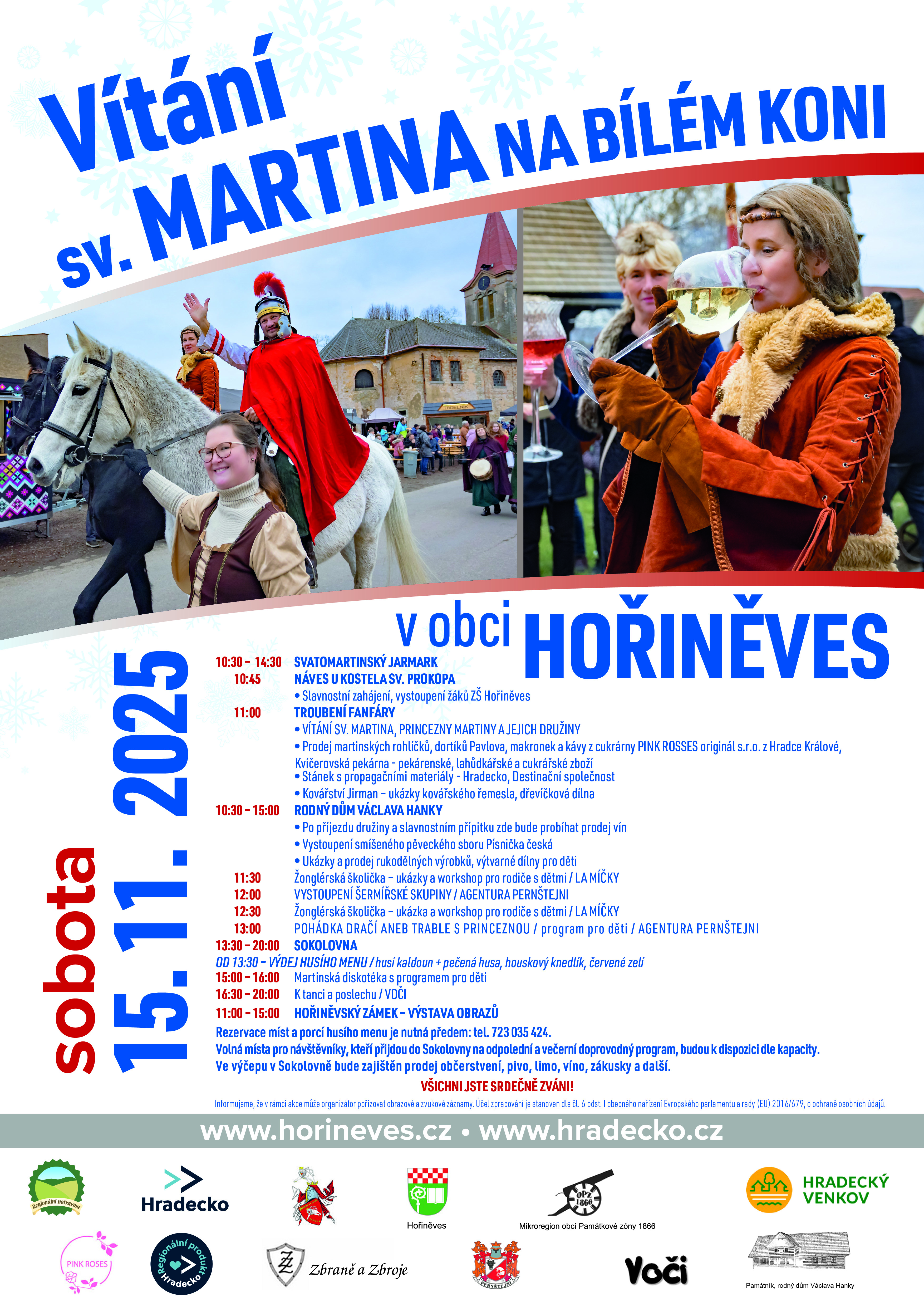 Přivítání u kostela, u Hankova domu následuje přípitek svatomartinským vínem, nově - prodej mladých vín přímo z hořiněvských zámeckých sklepů.