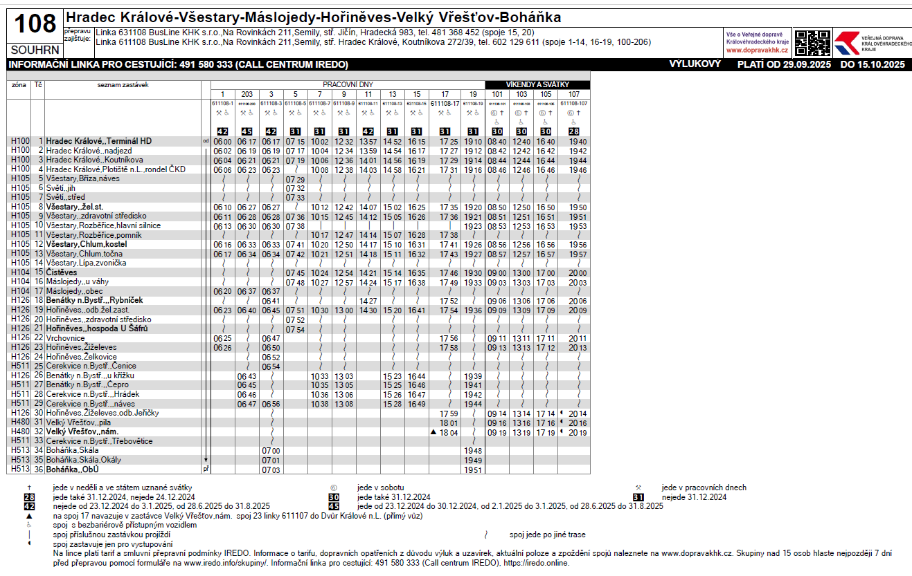 - 611108 Hradec Králové-Všestary-Máslojedy-Hořiněves-Velký Vřešťov-Boháňka, BUSLINE KHK s.r.o.